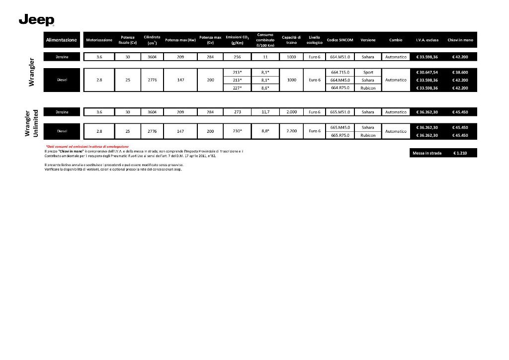 Jeep Wrangler: tutti gli optional e i prezzi, anche per la Unlimited