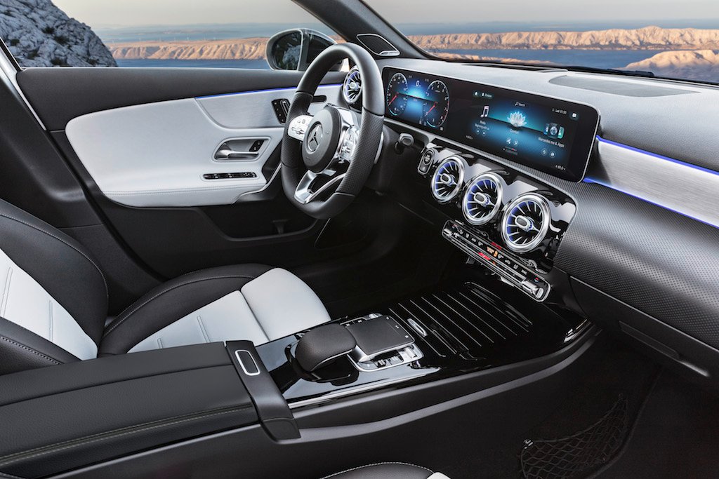 L’architettura particolare degli interni si deve soprattutto alla plancia portastrumenti, sprovvista della classica calotta di copertura. In questo modo il corpo di base, a forma di ala, si estende ininterrottamente da una porta anteriore all’altra. Il doppio display widescreen, sospeso sulla plancia, è disponibile da 7’’ e/o 10,25’’. Il sistema MBUX (Mercedes-Benz User Experience). Per la prima volta Classe A può viaggiare in modalità parzialmente autonoma. Il presupposto fondamentale è la capacità di sapere cosa succede nelle immediate vicinanze: sistemi perfezionati basati su telecamere e radar monitorano la strada fino a 500 metri di distanza. Distronic, sistema di assistenza attivo alla regolazione della distanza, può assistere il guidatore in molteplici situazioni sulla base dei dati di navigazione e modificare la velocità in prossimità di curve, incroci o rotatorie. Il maggiore ricorso a lamiere d’acciaio ad alta e altissima resistenza e a lamiere d’acciaio formate a caldo che contribuisce alla maggiore stabilità in caso di sollecitazioni, ad esempio in caso di collisioni anteriori, laterali e posteriori e di cappottamenti. I fari a LED High Performance sono di serie per le versioni Business, Sport e Premium.